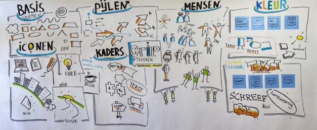 Donderdag 18 maart zit ik klaar met papier en stiften want op het programma staat: “Zakelijk tekenen”. De facilitator van deze avond was Wouter Niks, hij begeleidt bijeenkomsten waar hij gebruik maakt van visualisatie. Onderdeel hiervan is zakelijk tekenen, waarmee hij iedereen leert communiceren met stiften en papier om daarmee vervolgens de impact te vergroten op de werkvloer. Via een groot tekenbord heeft Wouter ons meegenomen door de belangrijkste stappen binnen het proces van het opbouwen van een succesvolle tekening. Visueel werken wordt steeds populairder in alle beroepsgroepen van medici tot financials. Het functioneel inzetten van tekeningen in een zakelijke context doe je om je ideeën te verhelderen, overzicht te creëren, je boodschap kracht bij te zetten en tot de verbeelding van je collega’s te spreken. Basis ingrediënten Om een duidelijke overzichtelijke tekening te maken zijn er een aantal basis ingrediënten die terug kunnen/moeten komen om je doel te bereiken. Zie hieronder…